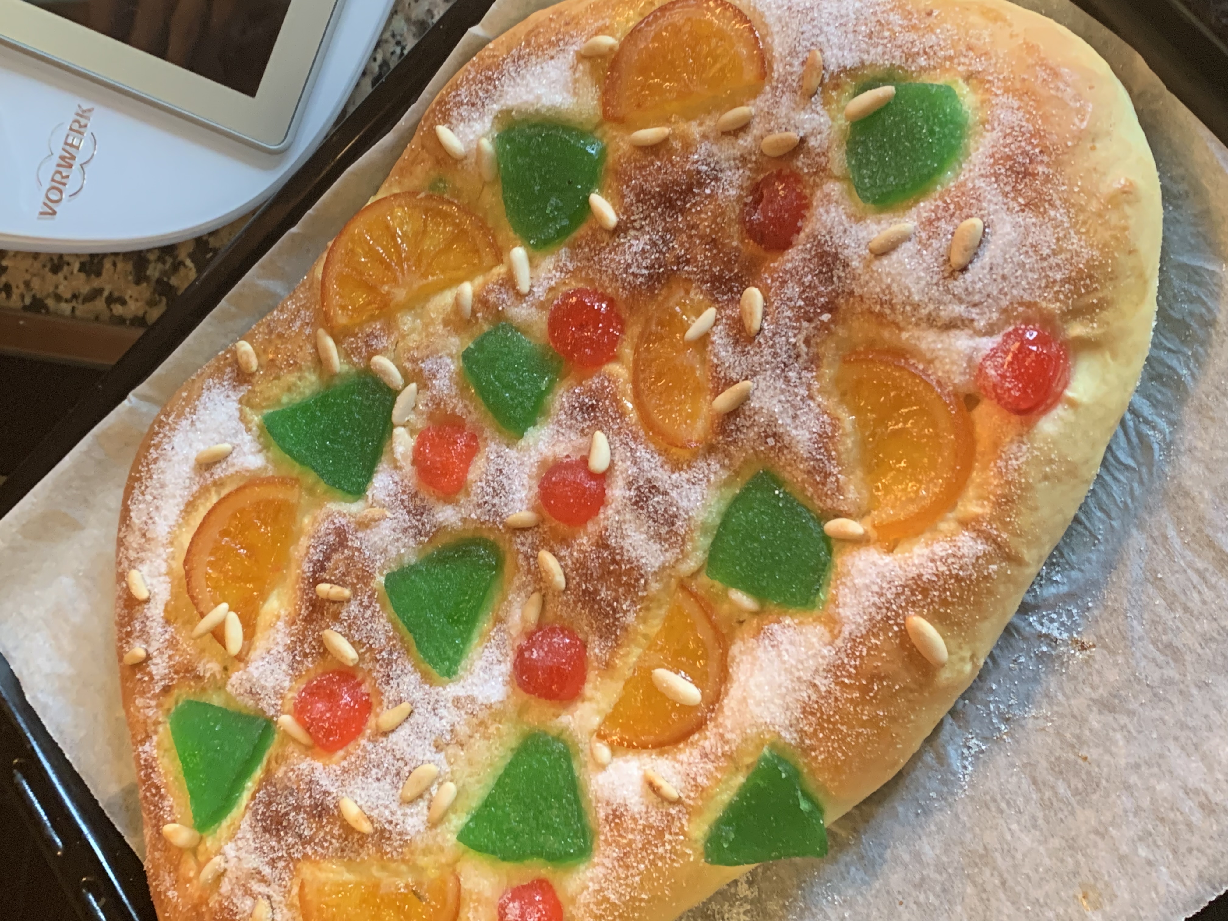 •Decoración: Huevo batido, fruta escarchada, piñones y azúcar.