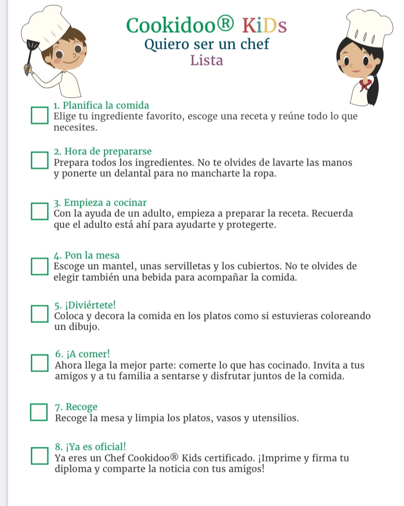Entra en COOKIDOO KIDS, escoge receta, mira que no falte ningún ingrediente, descarga la lista de tareas y empieza el juego.