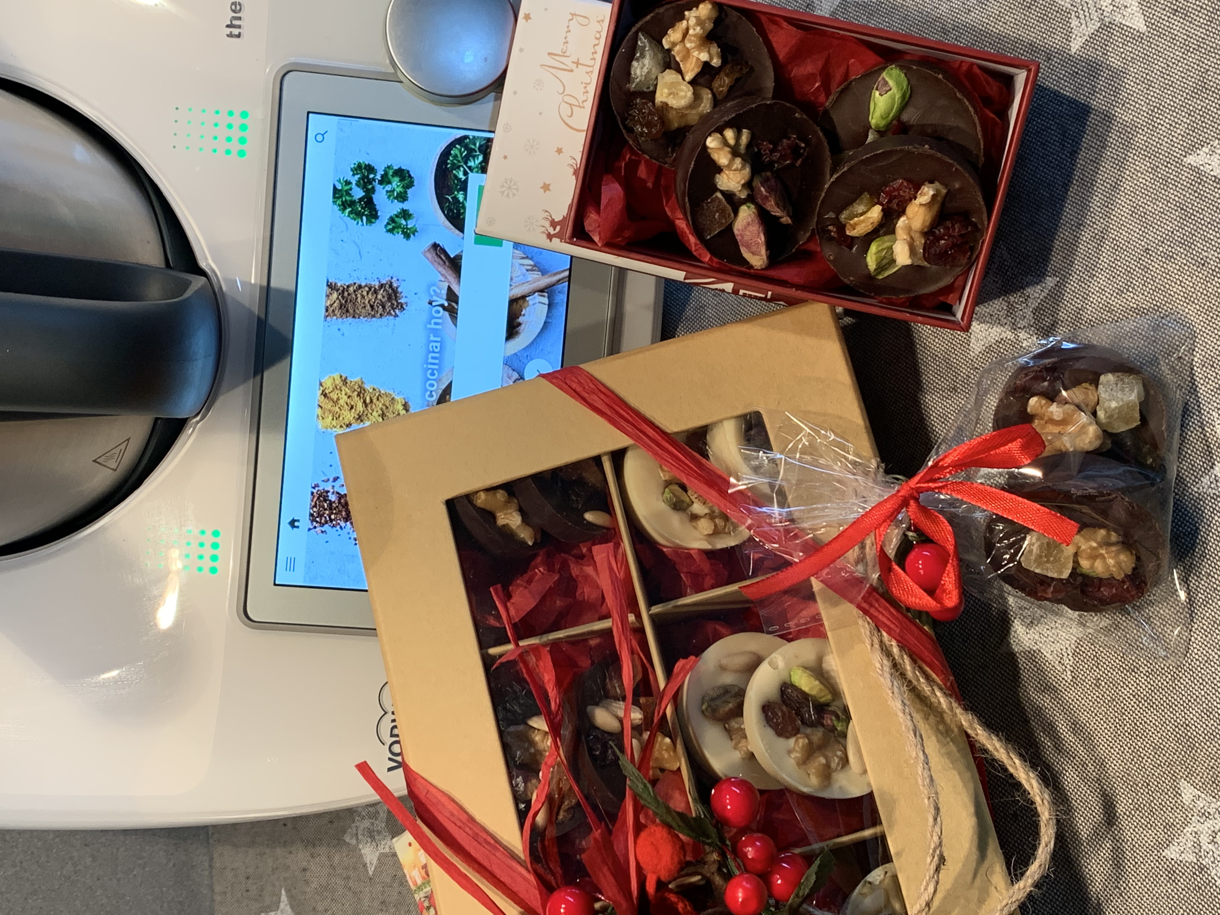 Hemos preparado regalos y adornos navideños, como no con la ayuda de nuestro THERMOMIX. Estos chocolates muy fáciles de elaborar, los puedes hacer con cualquier tipo de chocolate, y además admiten frutos secos, fruta escarchada incluso pétalos de rosa...etc.