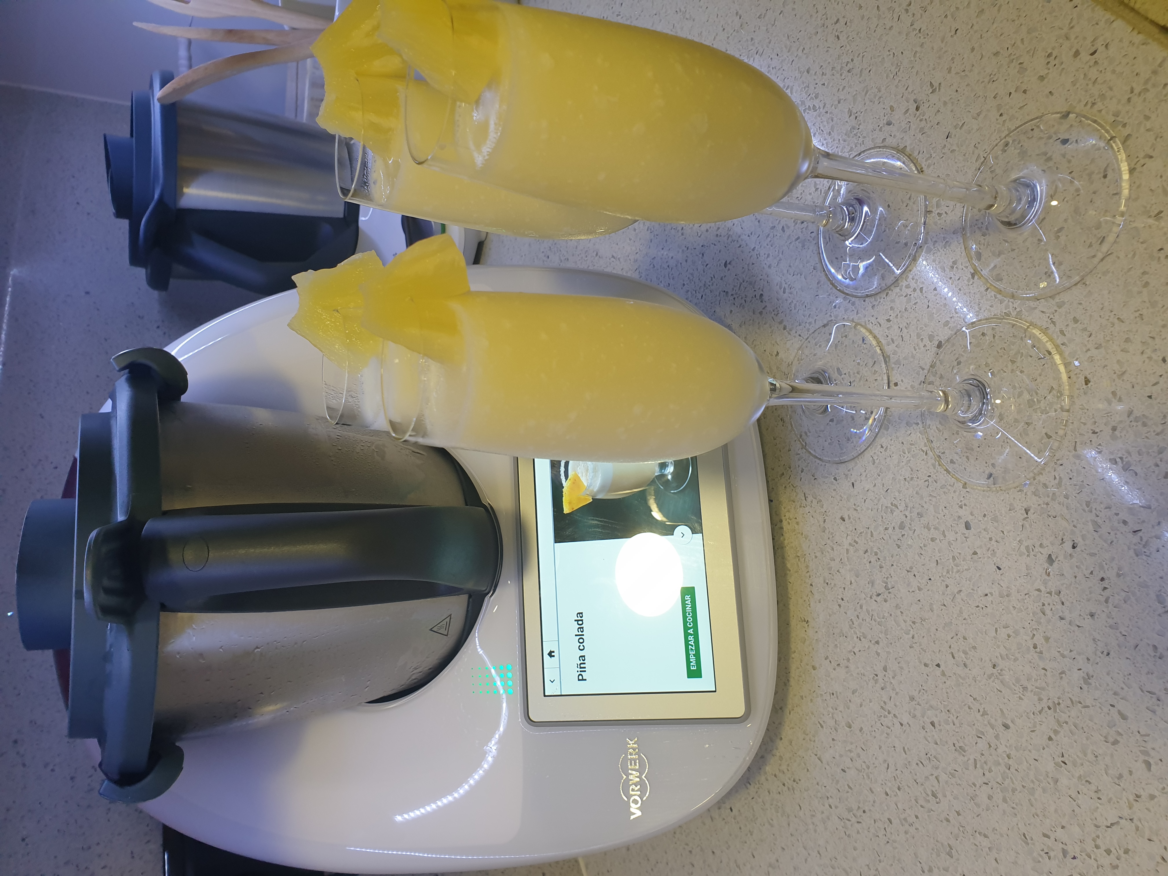 Para disfrutar de buena compañía esta Piña colada es fantástica,una combinación des sabores que te harán quedar de lujo. La leche de coco queda en contacto con el frio en bolitas frías que al tomarlo explosionan en la boca dando un sabor a coco fantástico. Animarte ha realizarla es una receta de cookidoo.
