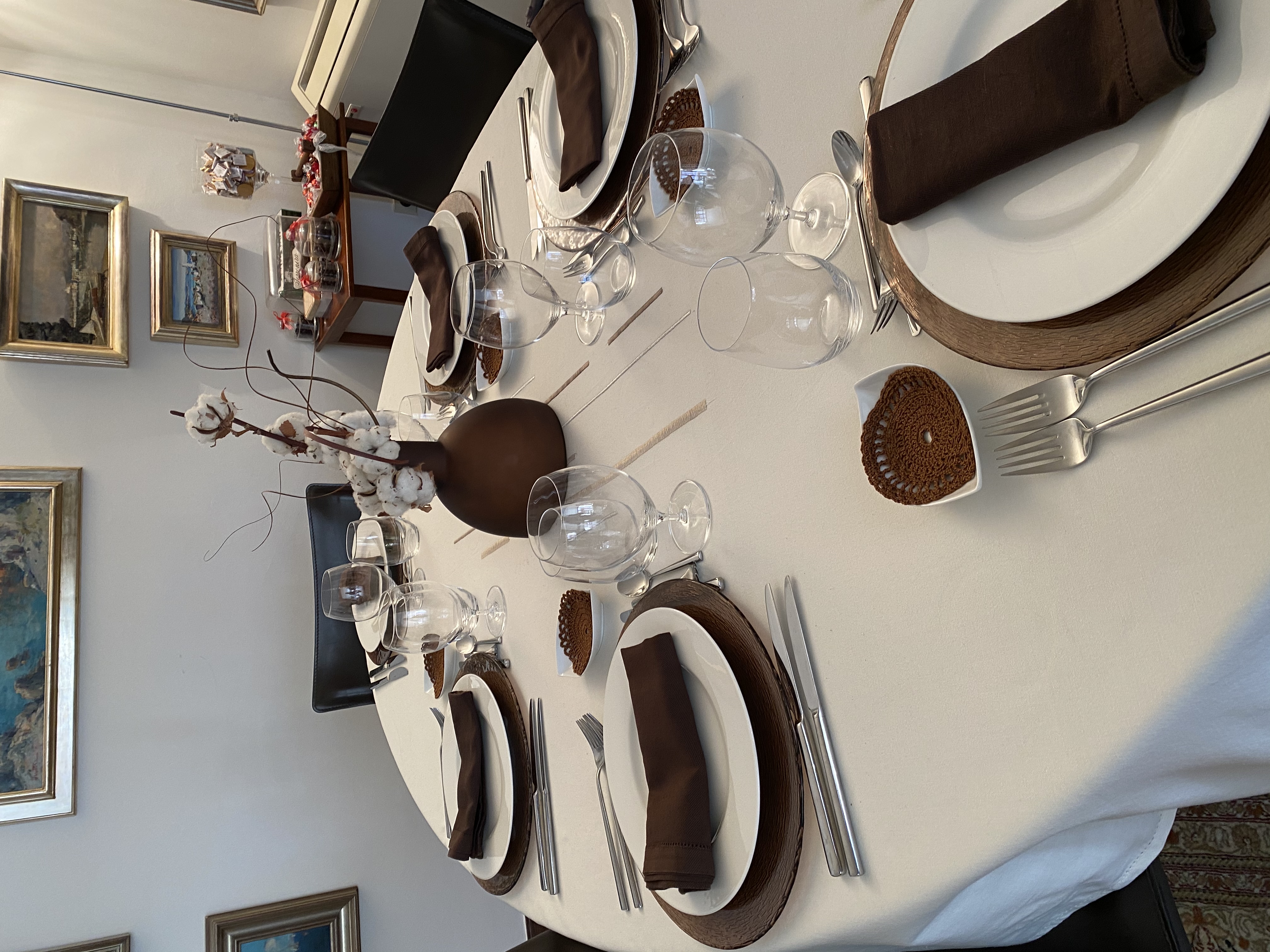 Mesa con decoración invernal, sobria, elegante. Bajoplatos de cristal marrón que resaltan encima de un mantel blanco roto con unos rayas bordadas en el centro de la mesa de distintos colores entonados, creando un clima de serenidad. Vajilla de porcelana “Bone China”, siempre elegante y que conjuga con casi todo tipo de platos de respeto y en este caso servilletas de color marrón. Los patitos del también son marrones al igual que el jarrón que decora la mesa. El toque invernal lo da las ramas de algodón. Espero que os guste.