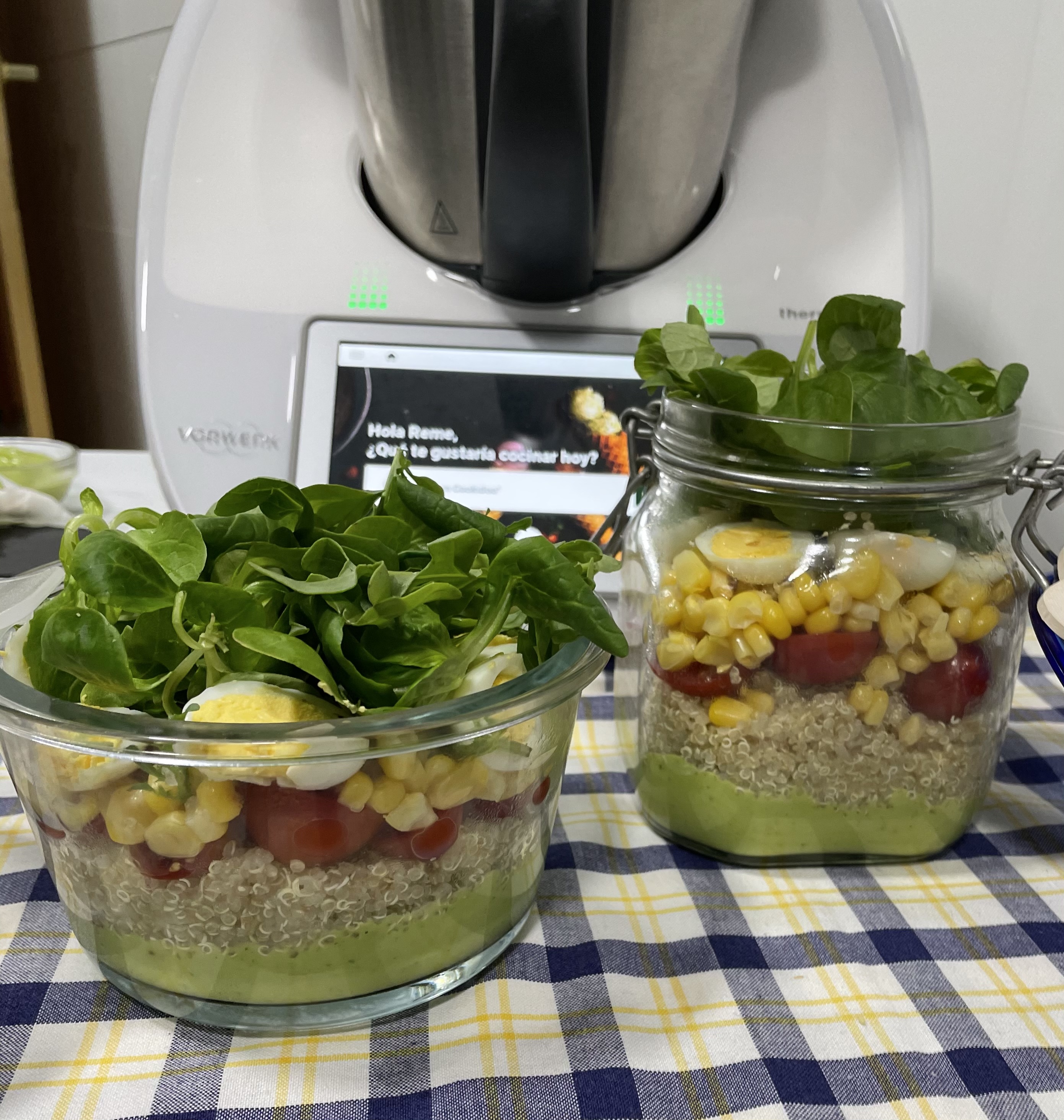 Esta receta la encuentras así tal cual en Cookidoo®️ ¨Ensalada verde de quinoa con huevos de codorniz y cherrys en tarro¨, pero también te la comparto a continuación: