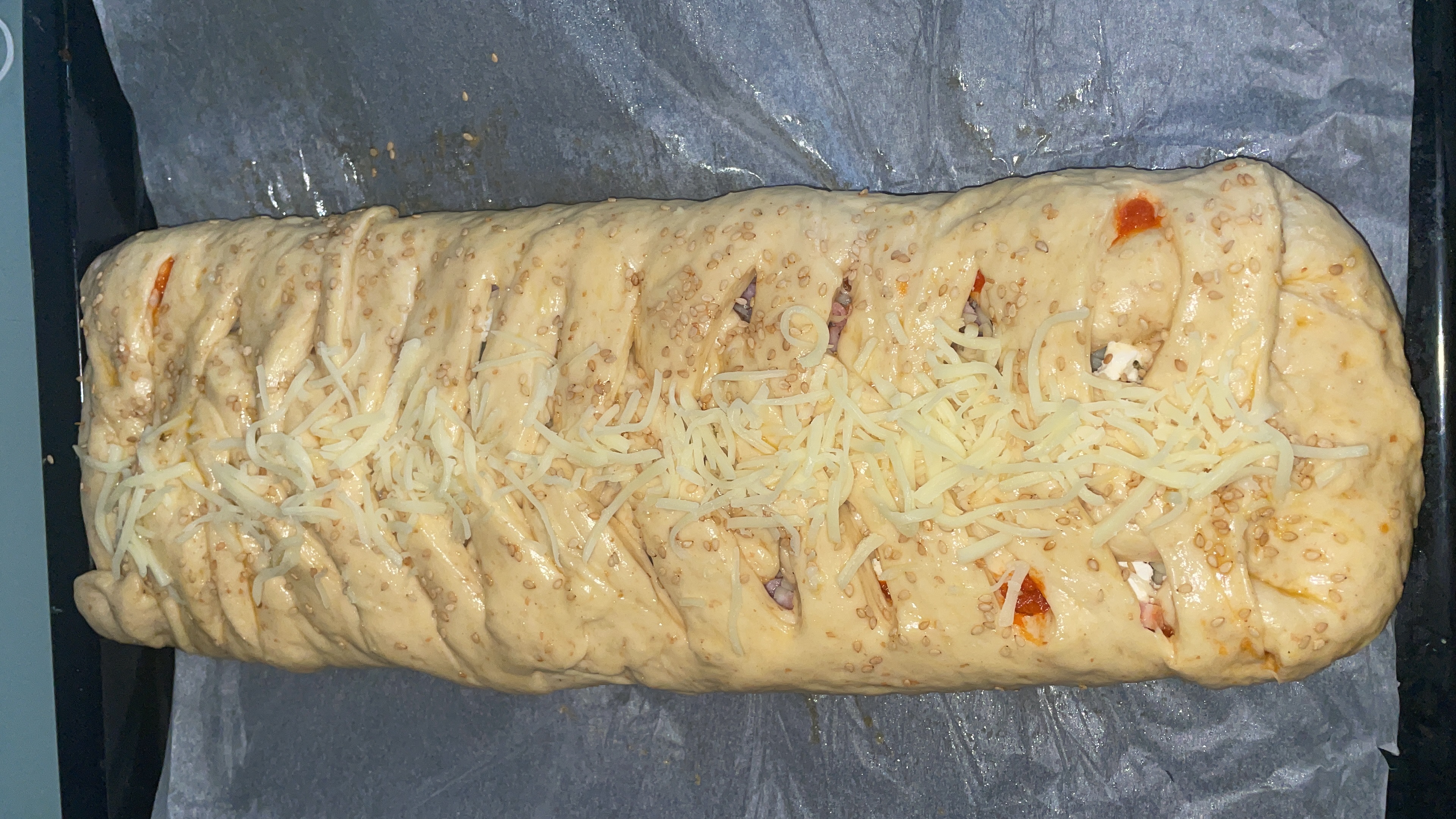 4. Con las manos engrasadas, retira la masa del vaso, colócala sobre una lámina de papel de hornear. Con las manos o con la ayuda del rodillo, extiéndela en forma rectangular que quede aprox 50x30 cm y pon en la bandeja del horno. Rellena solo el centro de nuestra masa de lo que más nos guste (tomate frito, salsa boloñesa, pisto con atún y huevos)… Ahora corta los dos laterales más largos de la masa como se ve en las imágenes y ve trenzando un trozo de la derecha y otro de la izquierda, así hasta llegar al final. Pinta de huevo y espolvorea con semillas de sésamo , queso o lo que más nos guste. Déjala reposar otros 30 minutos mínimo… ¡¡y al horno!! 180º arriba y abajo 20 minutos o hasta que esté dorada. ¡!No te pases de horno para asegurarte de que te quede de cine!