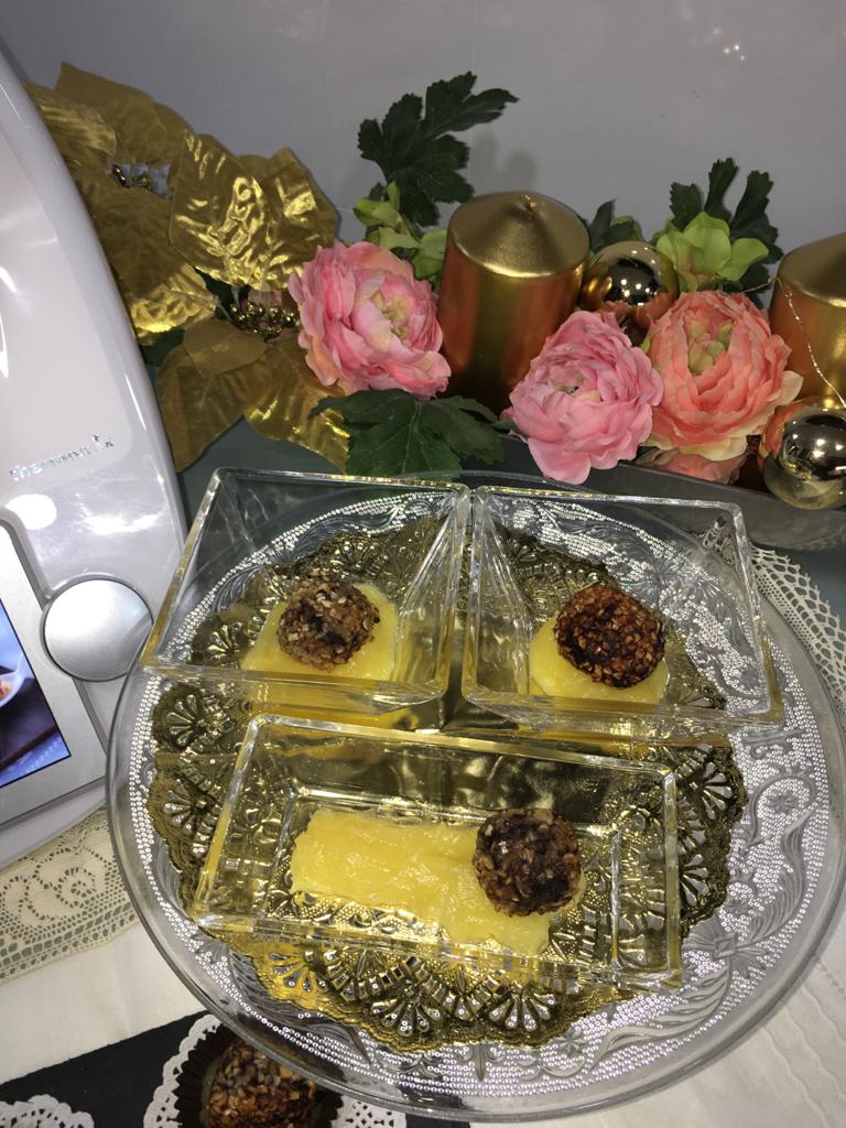 La presentación es libre yo he optado por una capsulitas de estas de las trufas poniendo una cucharadita de puré en el fondo para poner encima el bombón y con los cuencos cuadrados que tenia igual cucharada de puré y bombón encima.