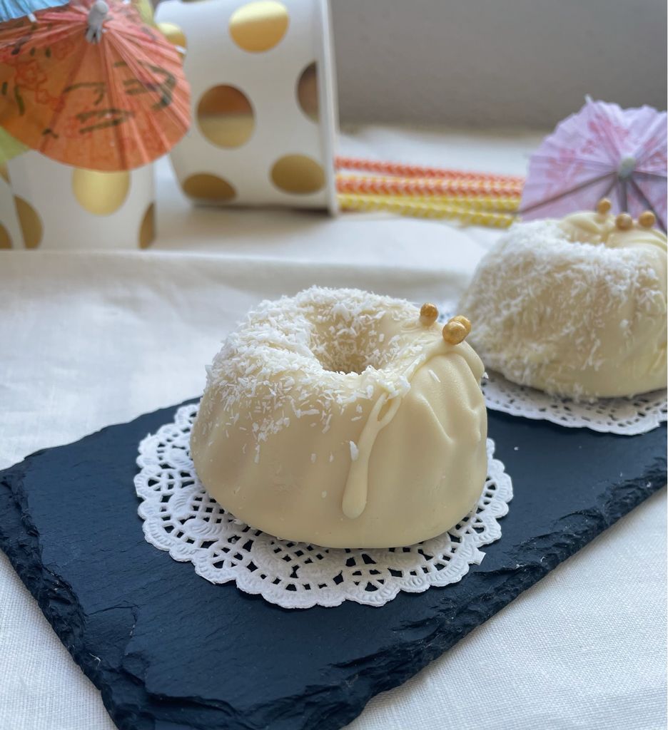 3. Decorar inmediatamente para que se peguen bien los detalles (en mi caso coco rallado y unas perlitas doradas, pero lo puedes decorar como más te guste).