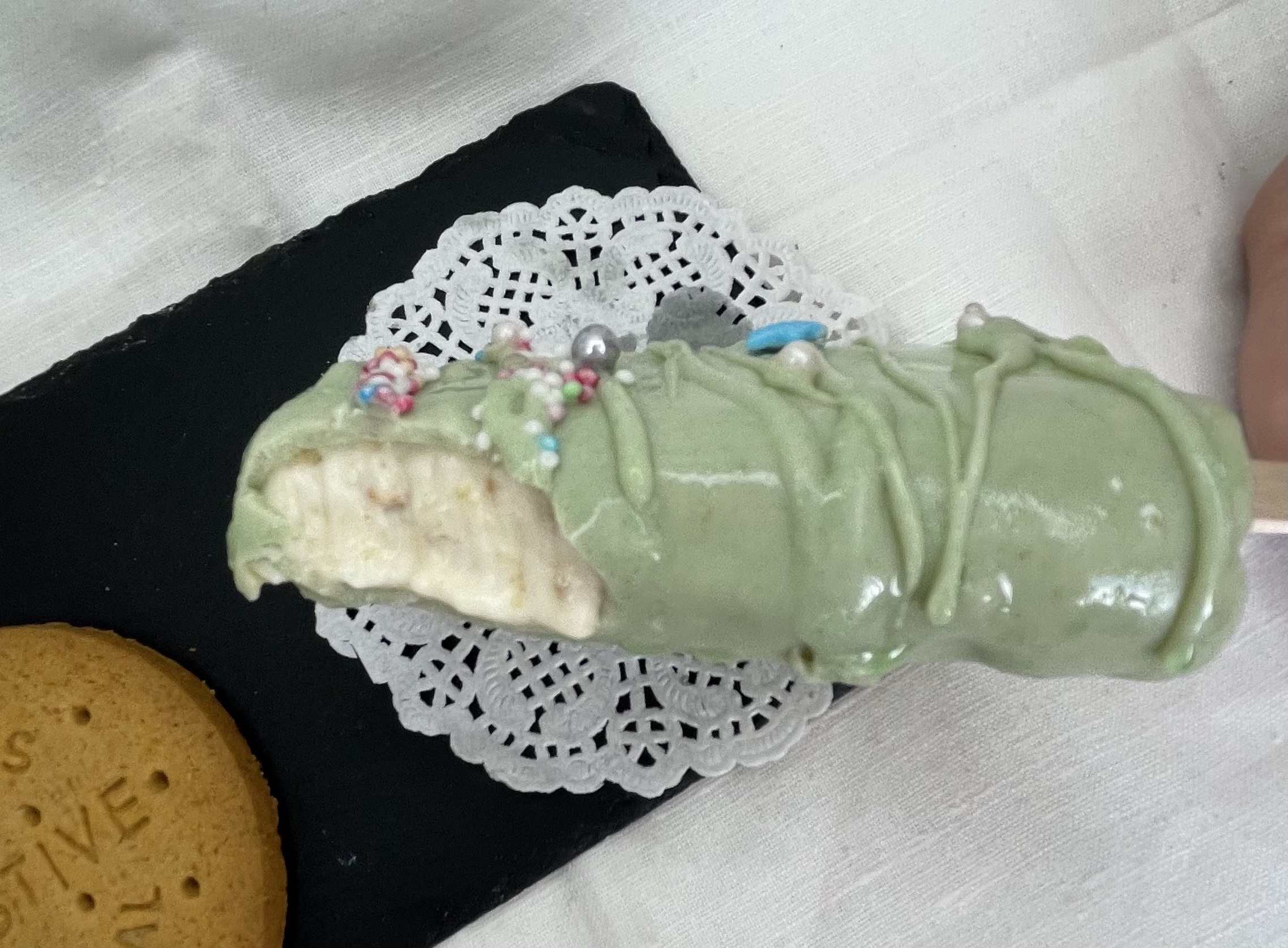 Cubre con chocolate blanco, con leche negro… yo al blanco le he añadido colorante verde. Y decora con confeti de colores, fideos de chocolate, ralladura de lima, limón, naranja o galleta…