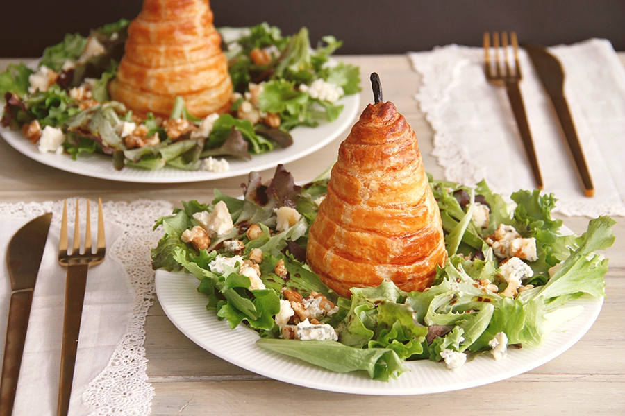 Esta ensalada es ¡impresionante! si, si, hazme caso, si quieres impresionar a tus invitados con una ensalada es cuestión de preparar estas peras con hojaldre. Después colocar una pera en cada plato con unos brotes de ensalada y una buena vinagreta.