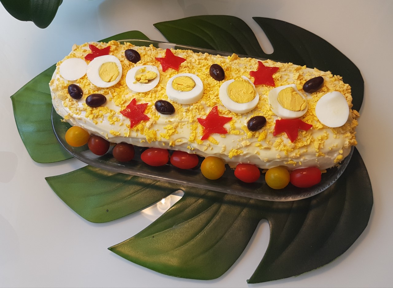 7. Untamos la superficie con mayonesa y decoramos con los ingredientes guardados anteriormente. LISTO!!!